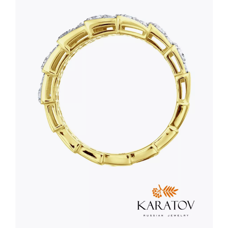 Кольцо женское выполнено из желтого золота 585 пробы с бриллиантами. Колечко с уникальным дизайном можно носить в любом возрасте, оно станет отличным украшением для женщины, девушки, а также для подростков. Золотое кольцо прекрасно сочетается с повседневными, вечерними и праздничными образами. Можно использовать на большой палец и на мизинец. Украшения бренда KARATOV - это не бижутерия. Для производства используются натуральные драгоценные металлы. Такие изделия обладают особой прочностью и долговечностью. Золото не тускнеет со временем, сохраняя ослепительное сияние и не подвержено деформации. Материал не слишком прихотлив в уходе и, если соблюдать простые правила, украшение надолго сохранит первоначальный внешний вид. Кольцо необходимо протирать раствором с добавлением мыла и очищать щеткой с мягкой щетиной. Ювелирные изделия устойчивы к царапинам, не изменят свой цвет со временем, гипоаллергенны и подойдут для людей с чувствительной кожей. Чтобы покупка радовала вас, как можно дольше, рекомендуем избегать контакта с агрессивными химическими и парфюмированными средствами. Гарантийный срок составляет 6 (шесть) календарных месяцев и исчисляется со дня получения заказа. Коллекции KARATOV - словно собрание удивительных историй, в которых каждый найдёт что-то своё. Мы воплощаем счастливые моменты вашей жизни в уникальных украшениях – это готовый подарок в брендированной упаковке для любимой, мамы, бабушки, невесты, жены и подруги. Поводом может быть любой праздник: свадьба, 8 марта, юбилей, новый год, день рождения и другие. Заявленное качество подтверждается в Федеральной пробирной палате клеймом, которое свидетельствует о подлинности и пробе изделия. Значения веса на фото и в характеристиках являются примерными и могут отличаться от фактических, которые будут указаны на бирке в комплекте с вашей покупкой.