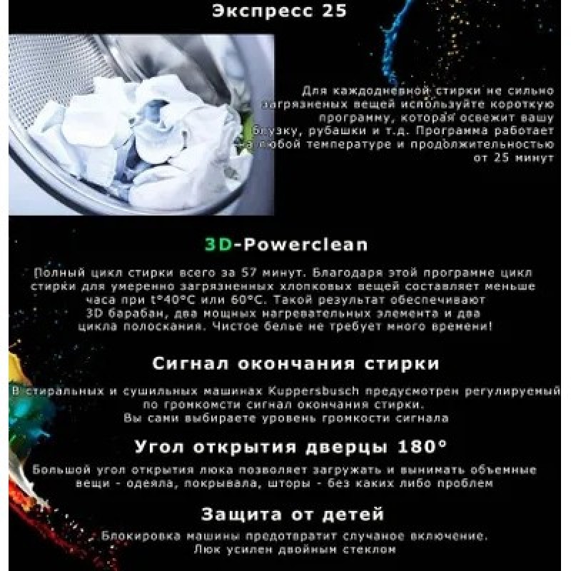 Стиральная машина Kuppersbusch W 20.0 W белаяПрограммы/дополнительные программы:Программы стирки от 20 до 90°C (2 нагревательных элемента) Программы экспресс-стирки на любой температуре длительностью от 20 минут Стандартные программыХлопок, Хлопок 3D-Powerclean, Легкий уход, Ручная стирка, Шерсть, Шелк, Тонкое белье, Смешанная стирка, Быстрая стирка 15 минут, Сорочки/Блузки, Разглаживание, Спортивная одежда, Джинсы, Шторы, Пропитка, Детское белье, Автоочистка (Программа очистки машины)Программы ECO Хлопок, Легкий уходДополнительные функцииЭкспресс, Предварительная стирка (пятна), Уменьшение температуры, Скорость отжима, Остановка полоскания, Замачивание3D стирка - это возможно !Особенности оснащения: Большой цветной дисплей 4.3“Ребра барабана для 3D-Стирки (технологии 3D-Washing)Шумоизоляция: Silent PlusСветодиодная подсветка барабанаДатчик регулирования загрузкиИндикация хода программы и времени до окончания программыОтложенный запуск – до 7 днейИндивидуальные настройки: например, дополнительный цикл полосканияРегулируемый по интенсивности акустический сигнал окончания программыБак из нержавеющей сталиУгол открывания люка – 180°, диаметр люка – 34 смВозможность перенавески люка (правая/левая)Хромированный люкЗащита от детей, двойное стекло люкаСистема защиты от протечки Aquastop / Контроль пенообразованияКомпенсация дисбалансаИндикация подачи / слива водыОбзор специальных программУличная и спортивная одеждаЭта группа программ подходят для стирки одежды для различных погодных условий, курток для спорта и отдыха, а также современных тканей из микрофибры или с высоким содержанием микрофибры, например, GoreTex или SympaTexУход за домомПрограммы группы «Уход за домом», для которых используется большой объем воды и низкая скорость отжима, хорошо подходят для стирки изделий бытового назначения из смешанного типа ткани и синтетикиОдежда для бизнесаНемнущиеся рубашки и блузки, как правило, можно не гладитьАнтибактериальная обработкаПрограммы группы «Антибактериальная обработка» позволяют уничтожить большинство вредных для здоровья микроорганизмов и клещей , а также эффективно вымывать аллергены из тканейОбзор дополнительных программЭкспрессДанная дополнительная программа предназначена для бережной стирки слегка загрязненного белья. Снижает потребление электроэнергии и продолжительность программы стиркиПредварительная стиркаДля особо загрязненной одежды, сложных пятен (кровь, пятна от белка и пр.), а также для рабочей одежды.Температура стирки: 30 °CИнтенсивная стиркаПрограмма предназначена для сильно загрязненного белья, особенно с пятнами, которые необходимо отбеливать (например, от фруктов, кофе, чая, красного вина, масла). Длительность цикла стирки увеличиваетсяТемператураТемпературу стирки можно поэтапно уменьшать с шагом 10 °C. Текущая температура отображается на дисплееСкорость отжимаУменьшение скорости отжима обеспечивается бережное отношение к деликатному белью. Текущая скорость отжима отображается на дисплееОстановка полоскания (режим «Без отжима»)Дополнительная программа остановки полоскания позволяет избежать образования складок на деликатном белье, оставив его в последней воде для полосканияЗамачиваниеПосле нажатия кнопки запуска программы начинается отсчет времени замачивания; оставшееся время до запуска програ